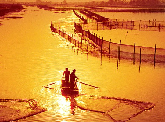 朝阳初升,辛勤的养蟹师们头戴斗笠、足踏轻舟,开始了一天的忙碌。 玉米、小鱼、螺蛳,以这三种纯天然食材搭配而成的饵料,荤素均衡、营养丰富,是大闸蟹的最爱。